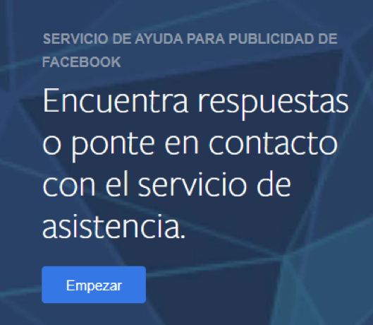 Lo primero que debes hacer es entrar a la página web: https://www.facebook.com/business/help/support. En la parte izquierda de esta página te encontrarás un mensaje en blanco sobre fondo azul que pone: “Encuentra respuestas o ponte en contacto con el servicio de asistencia”. En la parte inferior hay un botón azul en el que dice “Empezar”. Es ahí donde debes clicar.