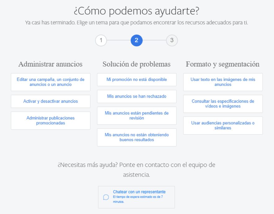 En caso de no encontrar respuesta, debes ir a la parte inferior de la página y clicar encima de “Chatear con un representante”. Cuando accedas te pedirá una serie de datos: nombre, teléfono, dirección de correo electrónico, cuenta publicitaria y página de Facebook. También tendrás que elegir entre una serie de opciones a la pregunta.